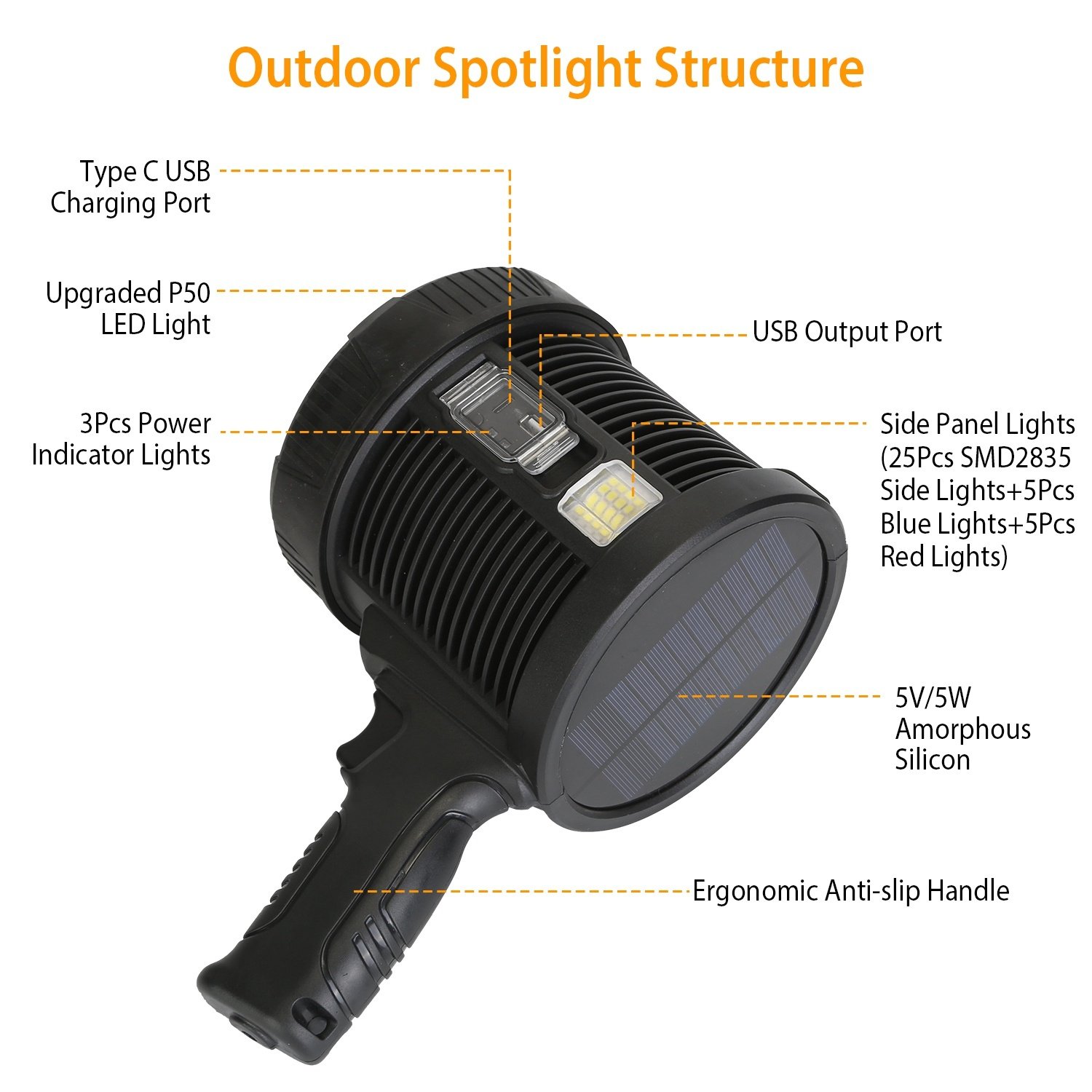 *IPX6 Waterproof Outdoor Spotlights*:IPX6 Waterproof outdoor handheld lamp can resist splashing water from all angles. It is suitable for the outdoor environment and adverse weather conditions. Made of premium ABS material; the flashlight is skid-proof; explosion-proof and shockproof.