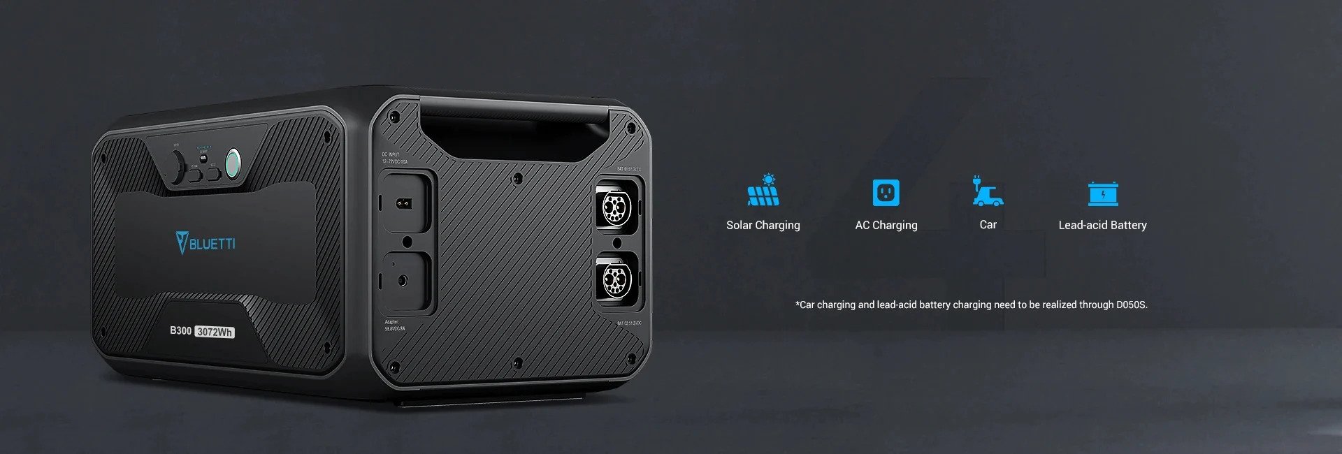 [Dual Recharging] - Draw power from solar and grid simultaneously to replenish B300 in less than 4,4 hrs with max. 700W input. Extra accessories are required for AC/car/lead-acid battery charging.