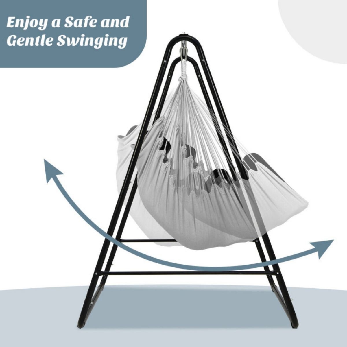 This hammock chair with a stand makes outdoor life more leisurely!After using the reinforced carabiners to firmly connect the hammock chair to the stand, you can start to enjoy a safe and comfortable swinging experience. In the process of use, the sturdy steel frame with reinforced A-shaped structure and anti-slip foot pads will ensure strong stability. What’s more, the compact size allows you to use this hanging swing with stand indoors or outdoors based on your preference.If you are looking for a hammock chair like this, do not hesitate to place an order!Increase the contact area with the ground for strong stability