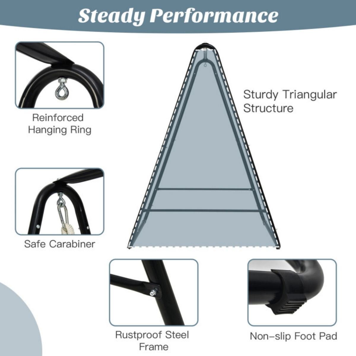 2.Steady Performance: The hammock chair stand is constructed of heavy-duty and rustproof steel frame, which ensures strong bearing capacity up to 265 lbs. Furthermore, the sturdy triangular structure takes stability to the next level. And the reinforced hanging rings and safe carabiners make the connection to the hammock chair easily.