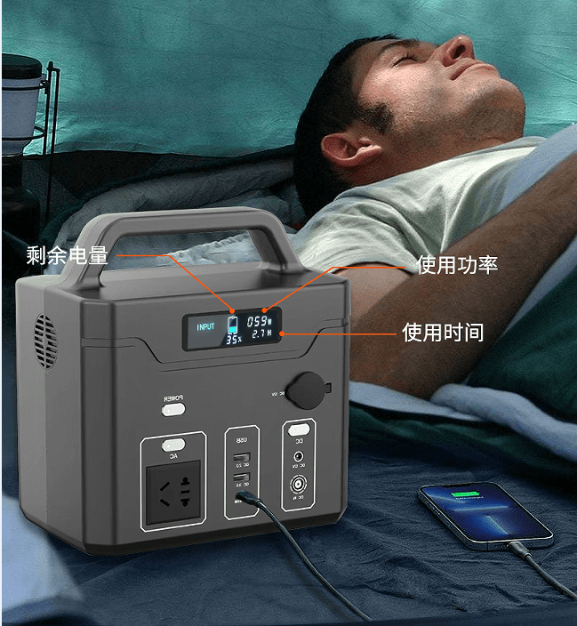 Suitable for home emergency power failure, emergency rescue, outdoor work, outdoor tourism, camping and other application occasions. The product has different port voltage output such as USB, Type-C, DC6.5 * 3.0, cigarette lighter and AC, and built-in 6W LED lighting and SOS alarm function.